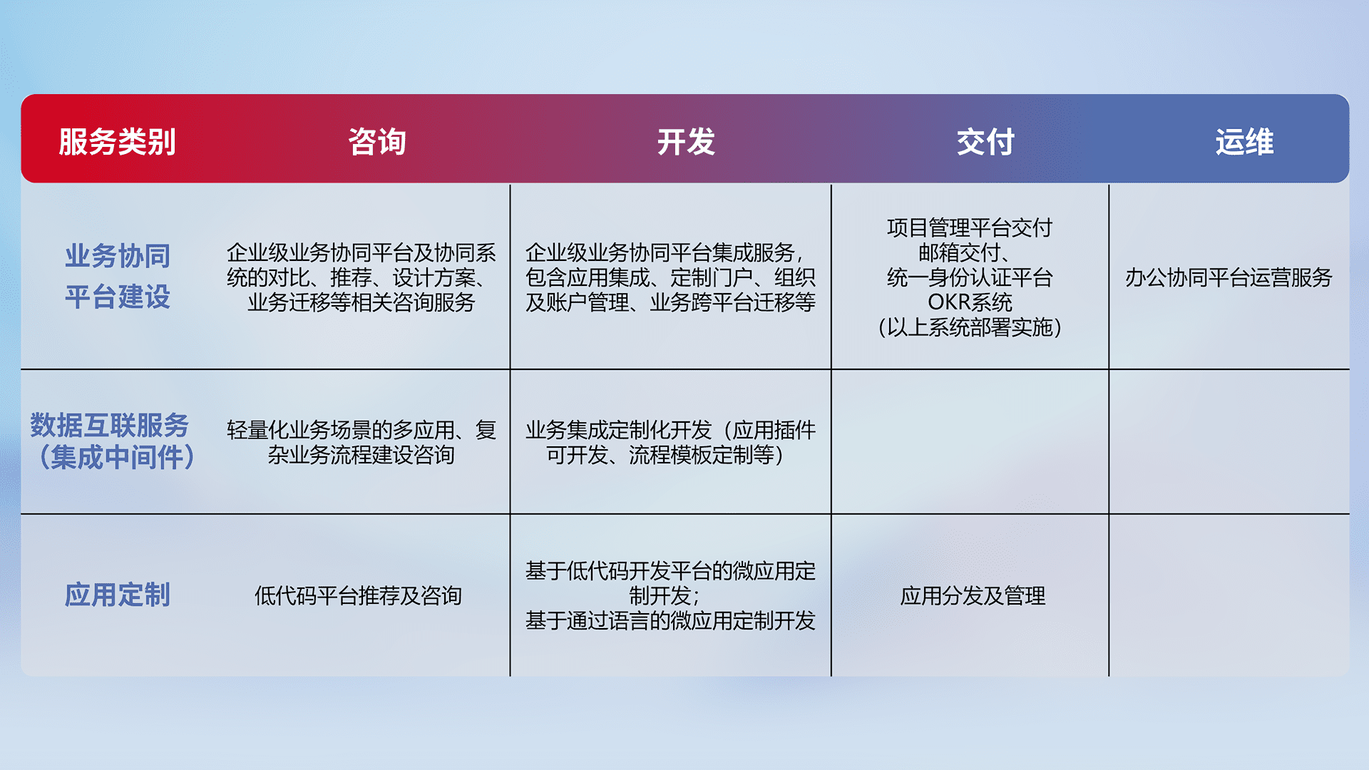针对钉钉、、、、企微、、IDaas等平台级产品提供产品的规划、、、、方案、、、交付、、、、定制化开发等服务,,,实现如统一协同办公、、智能客户服务、、、混合会议管理、、智能数据查询、、、、等业务场景,,实现数字化转型。。。